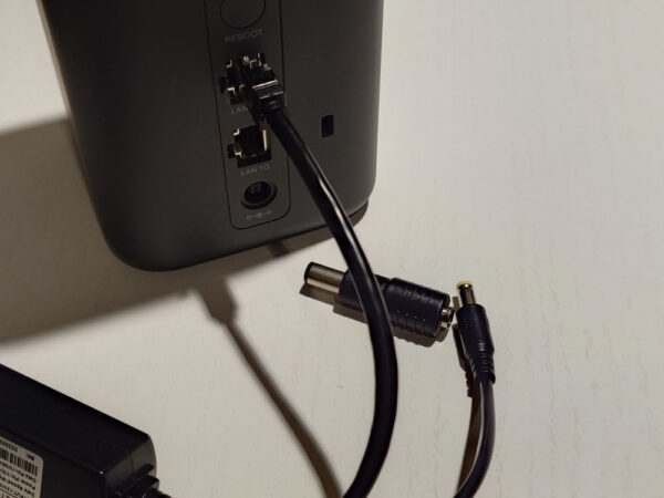 左側のRJ45ポートにPoEスイッチに繋がったLANケーブル(48V前後)を挿すと、右側のDCプラグに12Vの電源が供給されるようになります。